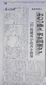 京田辺の病院 保健所が改善を要求 京都府京田辺市にある民間の内科・精神科病院(約250床)で、おむつの取り換えが必要な一部の痴呆症老人を10年以上も男女同室で入院させていることが5日わかった。病室の男女区分については法律上の定めはないが、厚生省は「社会通念上、別室にすべきだ」としており、京都府田辺保健所は同日までに改善を指導、事態を重視した府も各保健所に、男女同室にしている病院がないか文書で注意を呼びかけている。 私の『議会だより』14号を見て、毎日新聞が取り上げてくれました。 しかし、それまでの府や保健所の指導が適当だったのか。現在、京都府に医療監視についての情報公開を申請中です。 | ||||||||||||||||||||||||||||||||||||||||||||||||||||||||||||||||||||||||||||