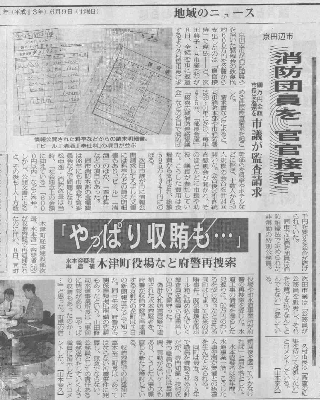 京田辺市 消防団員を「官官接待」 600万円全額を市長は返還を 市議が監査請求 毎日新聞 2001年6月9日 |