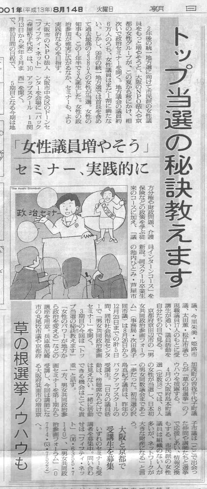 トップ当選の秘訣教えます 「女性議員増やそう」 セミナー、実践的に 草の根選挙ノウハウも 朝日新聞 2001年8月14日 夕刊 |