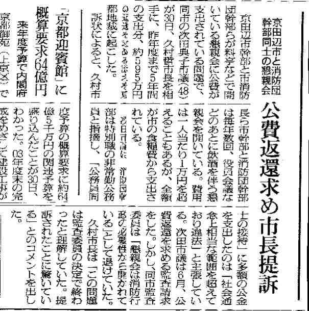 京田辺市と消防団幹部同士の懇親会 公費返還求め市長提訴 朝日新聞 2001年8月31日 |