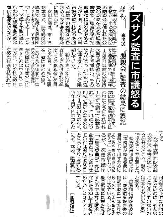 ズサン監査に市議怒る 京田辺 “懇親会”監査の結果に誤記 洛南タイムス 2001年11月6日 |