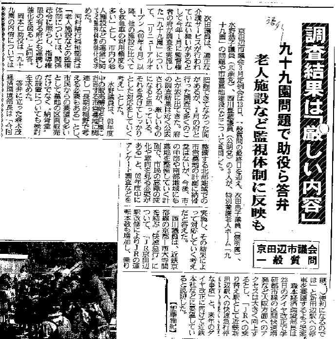 調査結果は「厳しい内容」 九十九園問題で助役ら答弁 老人施設など監視体制に反映も 京田辺市議会一般質問 洛南タイムス 2002年3月14日 |