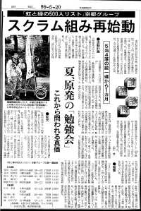 来世紀の地方自治を占う統一地方選から約一カ月。無党派譲員らの全同ネットワーク「虹と緑 の500人リスト」の京都グルーブは五人が議席をつかんだ。メンバーは、七月の向日市議選に出る現職の応援を手始めに、夏 には勉強会を立ち上げる。地方から政治を変えよう、と再始動する姿を迫った。 朝日新聞 1999年5月23日 |