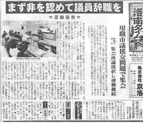 | 京田辺市の現職市議が府の青少年健全育成条例違反で起訴されている問題で、6日、市北部住民センターで「援助交際・買春を許さない!市民集会」が開かれた。市職員組合や市議会の次田典子議員らがつくる「11・6市民集会実行委員会」が主催したもので、今回の不祥事に関する市民側からのアクションはこれが初めて。ノック知事のセクハラ訴訟の被害者弁護団長・石田法子弁護士による講演が行われたほか、起訴されている南和男議員(55)のすみやかな議員辞職を求める集会決議を採択、あす8日にも本人に手渡すという。